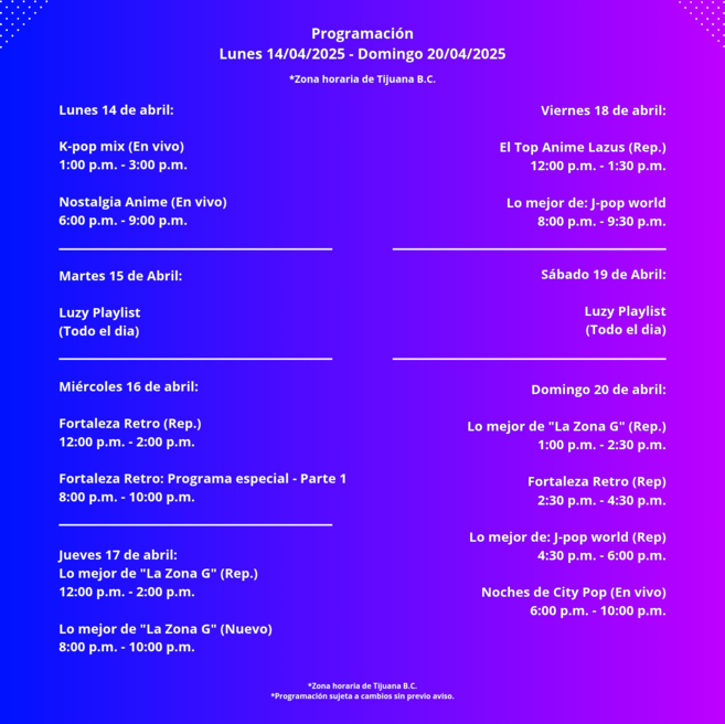 *La parrilla es actualizada semanalmente. Sujeto a cambios sin previo aviso.